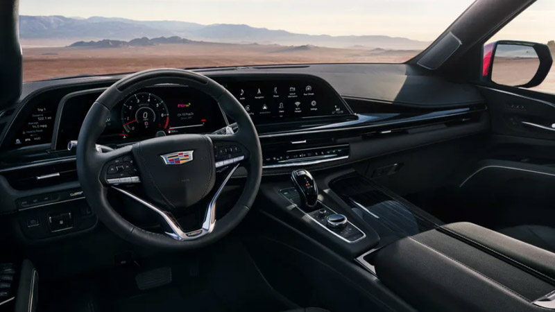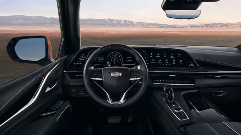 در داخل کابین کادیلاک Escalade-V، اولین نکته جالب توجه استفاده از صفحه نمایش منحنی ۳۶ اینچی است که طبق ادعای کادیلاک، نمایشگر فوق از تراکم پیکسلی دو برابری نسبت به یک تلویزیون 4K برخوردار است؛ ضمن اینکه در بخش میانی این صفحه نمایش ۳۸ اینچی، یک صفحه نمایش مرکزی ۱۴/۲ اینچی نیز وجود دارد که از فناوری واقعیت افزوده برخوردار است.