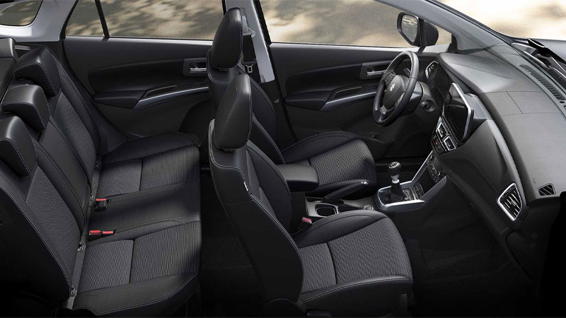 در نسخه پایه، صندلی‌ها مجهز به گرمکن به همراه سیستم تهویه دو نقطه‌ای، ورود بدون کلید و نورپردازی داخلی را به عنوان آپشن استانداردها بر روی اس کراس در نظر گرفته است. با نگاهی به لیست آیتم‌های ایمنی می‌توانید مشاهده کنید که همه تریم‌ها مجهز به امکاناتی نظیر سامانه شناسایی هوشمند علائم ترافیکی مسیر، کروز کنترل تطبیقی و نمایش نقاط کور دید راننده هستند.