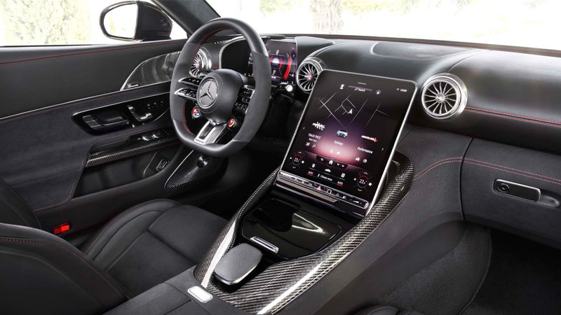 از دیگر نکات قابل توجه در طراحی داشبورد میتوان به فرمان اسپرت AMG Performance، صندلیهای AMG با ماهیچههای جانبی تطبیق پذیر با بدن سرنشین و قابلیت تنظیم برقی و نیز دو صندلی اضافه در ردیف عقب اشاره کرد که مورد آخر را برای اولین بار است که در SL شاهد آن هستیم و باید اذعان داشت صرفاً برای افرادی با قد متوسط، کوتاه یا کودکان مناسب است.
