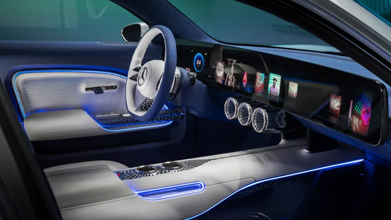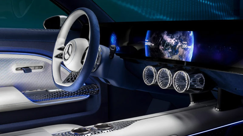 و اما در طراحی داخل کابین نیز همانند بدنه بازهم بنظر میرسد دغدغه اصلی بیشتر نمایش فن آوریهای پیشرفته بوده تا خلق فضایی خاص و نوآورانه، یک صفحه نمایش عریض مستطیلی ۱۲۰.۶ سانتیمتری که فاصله بین دو ستون A تا A جلو را پوشش داده و وضوحی 8k دارد به همراه سامانه ناوبری با گرافیک سهبُعدی فوقالعاده که میتواند یک شهر را از نمای ماهوارهای تا ارتفاع ۳۳ فوت (۱۰ متر) به تصویر بکشد هرچند بسیار جذاب بوده، اما حس و حالی مشابه S کلاس را به شما منتقل می کند. هرچند نباید از این نکته غافل بود که در طراحی کابین از مواد پایدار و دوستدار محیطزیست و بازیافتی استفاده شده که شامل پارچههایی از الیاف ابریشم مانند Biosteel، چرم گیاهی و فرشهای بامبو میشود.