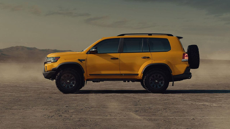 در نمای جانبی، طراحانِ خان تایرهای پروفایل بلند آفرودی و رینگهای ده پره مشکی، رکاب کناری به همراه یک کیت کاملاً یکپارچه در سمت راست خودرو را تدارک دیدهاند و در نهایت، برای نمای عقب، یک زاپاس بند متفاوت و سپر جدید با کاور های پلاستیکی کامل برای محافظت در برابر سنگ طراحی شده که توانسته تا حد زیادی جدیت در کاراکتر لندکروزر را بیشتر جلوه دهد.