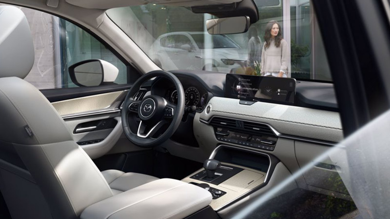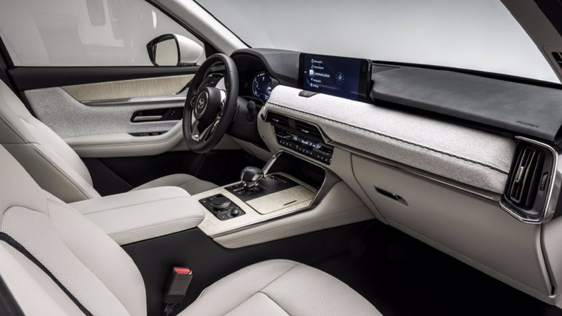 مجموعه داشبورد و کابین داخلی CX-60 نیز در راستای نمای بیرونی طراحی شده و بیانگر قدرت معماری یک SUV موتور جلو/دیفرانسیل عقب است. کیفیت مواد به کار رفته در فضای کابین کاملا مشهود و قابل لمس است، پانل داشبورد با خطوطی پیوسته که از طریق دریچههای سیستم تهویه در طرفین، با سطح پنل دربها ادغام شده بر وسعت، گستردگی و دلبازی فضای داخلی کمک میکنند.