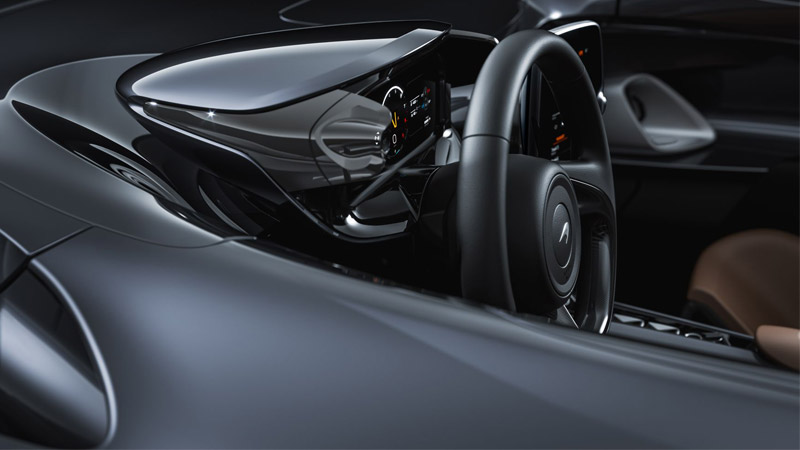 فرم خاص طراحی مکلارن در دماغه و چراغهای جلو همچنان دیده میشود، اما با تغییرات بسیار. چراغها به شکل C بزرگی دیده میشوند که در بالا و پایین نوک تیز دماغه به صورت مجزا قرار دارند. هواکش موجود روی کاپوت نیز از دیگر موارد خاص طراحی این خودرو است.