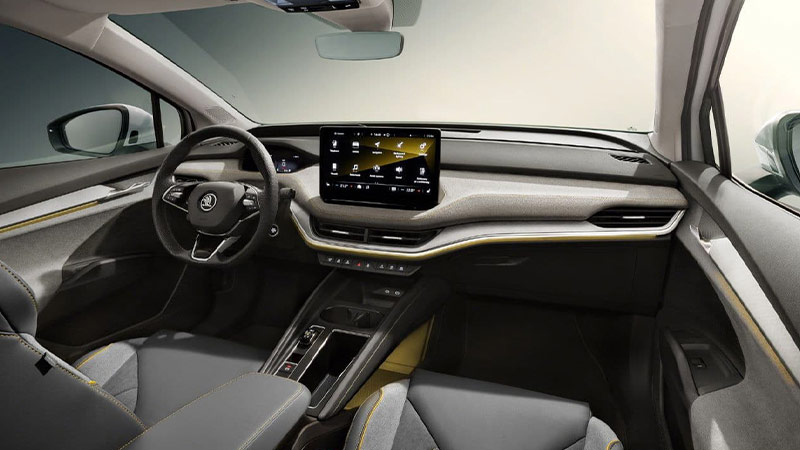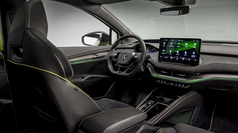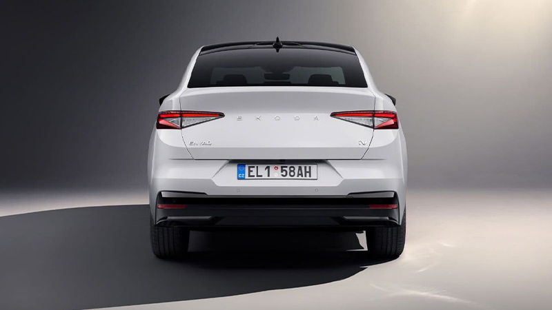 علاوه بر این، در نسخه RS که به نوعی ظاهر آن مشتق شده از نسخه Sport line است، دارای ویژگیهای برجستهتر استایلی مانند قاب مشکی براق جلوپنجره و خط سقف کمانی شکل و شیشههای جانبی، ورودیهای هوای خاص و متفاوت طرفین سپر جلو، دیفیوزر عقب به همراه شبرنگ سراسری زیر سپر و رینگهای ۱۹ تا ۲۱ اینچی است. همچنین، فرم کمانی شکل و شیبدار سقف که از ستون B به آرامی و با شیبی ملایم به سمت عقب امتداد مییابد، با درب صندوق باری که دارای لبههای برآمده تیزی است ترکیب شده و علاوه بر زیبایی فرمی، در بهبود چشمگیر آیرودینامیک این کوپه الکتریکی اشکودا که دارای ضریب درگ (cd) 0/234 است تاثیر بسزایی داشته است.