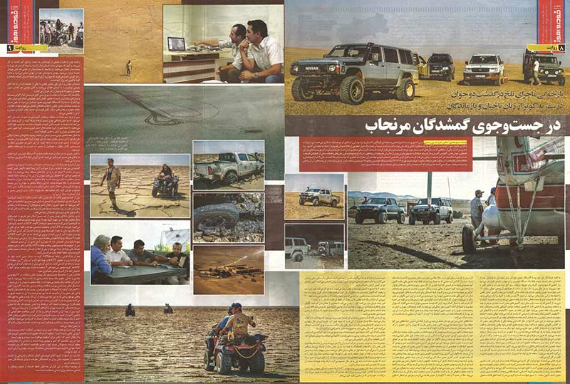 با چهار خودرو عازم منطقه شدیم. در بین راه شبیر گفت دو نفری که پیدا شدند در «کلانتری آران» هستند. موفق شدیم با یکی از نجاتیافتهها صحبت کنیم و اطلاعات ارزشمندی از او بگیریم. اول اینکه شب پنجشنبه، این افراد با اینکه آب زیادی به همراه نداشتند خودرو را ترک کردند. تصمیم گرفتیم اول به سمت خودرو حرکت کنیم و با توجه به جهت خودرو گشت را آغاز کنیم. در بین راه «بهراد طوقی»، «امیرحسین رستمی»، «حسن تعویقی» و «هادی توپچی» هم به ما ملحق شدند و با دو خودروی دیگر حوالی ساعت پنج بعد از ظهر به خودروی پرادو در شمال دریاچه نمک رسیدیم. صحنه عجیبی بود. خودرو در باتلاق گیر افتاده بود و تمام درها و کاپوت خودرو باز بود. یک موتور برق بزرگ آنجا رها شده بود. ظاهرا هرچه پیدا کرده بودند را زیر خودرو قرار دادند و کلی از وسایلشان را برای دادن علامت آتش زده بودند. همهچیز به جز آب و غذا!